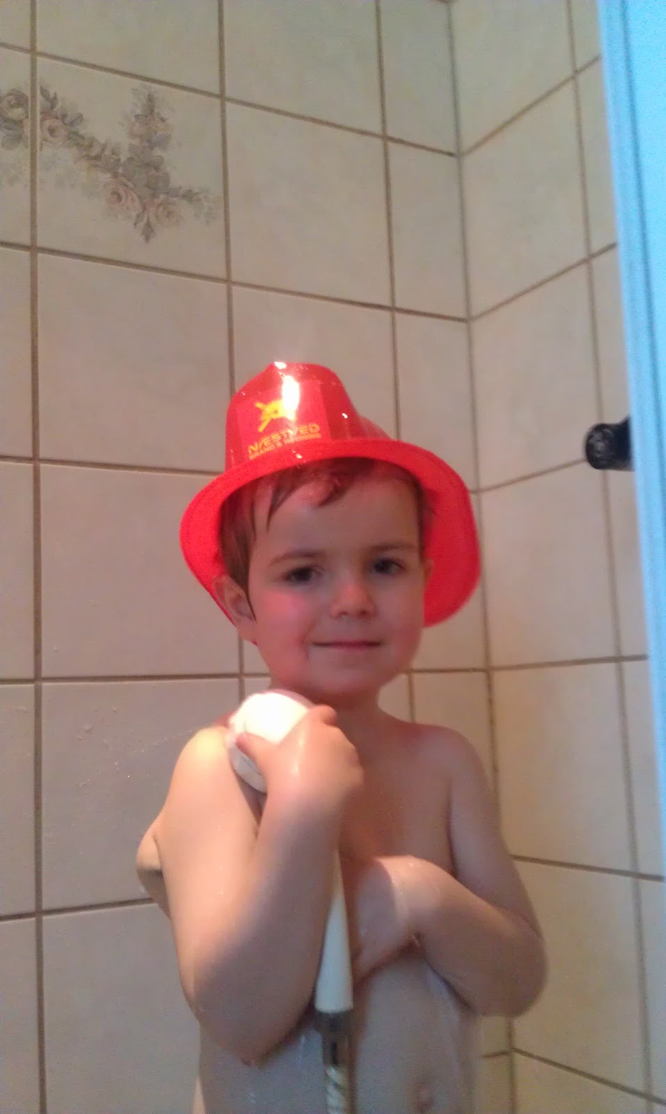 Nulle mener bestemt, at det er nødvendigt at have brandhatten på når han skal være brandmand i bruseren hi hi